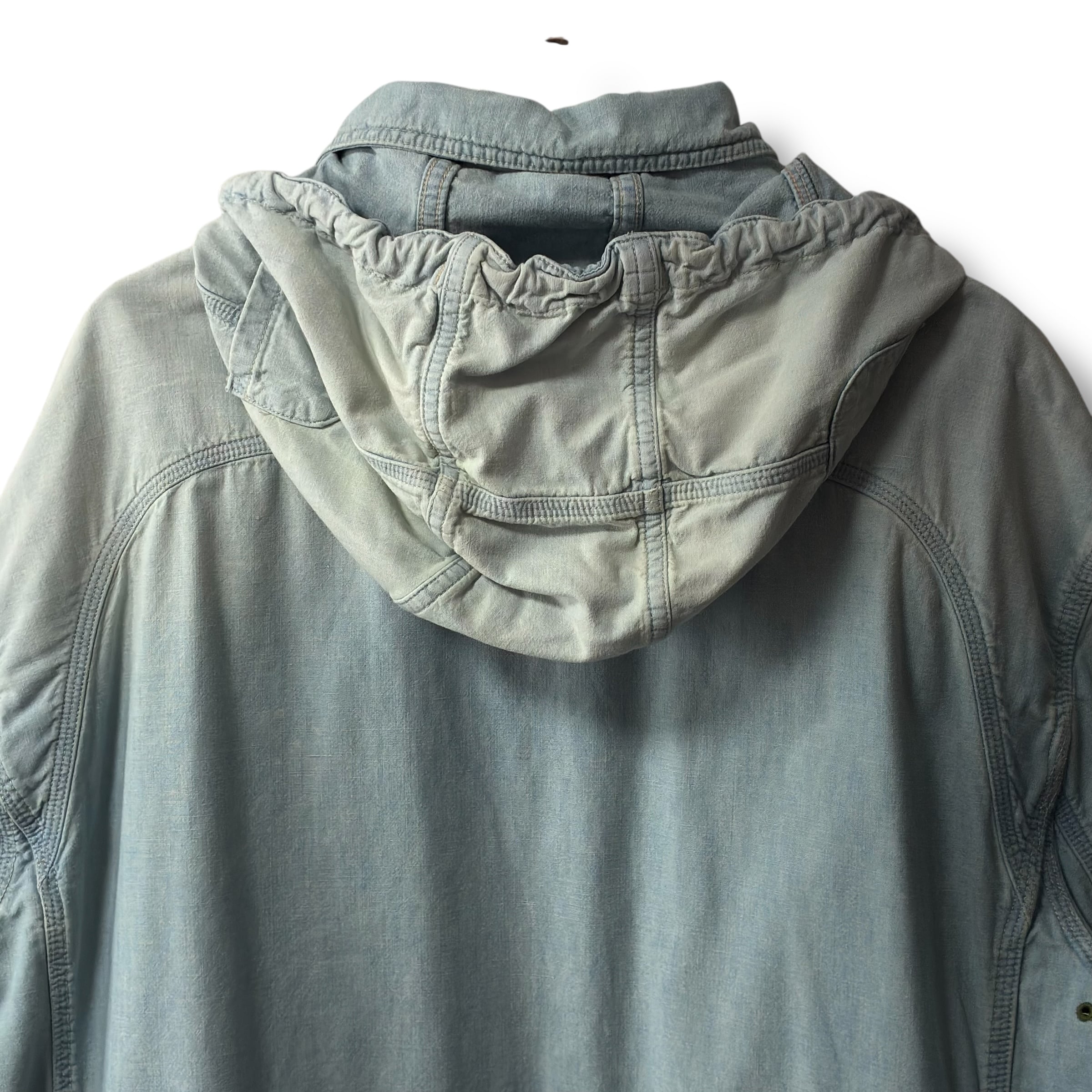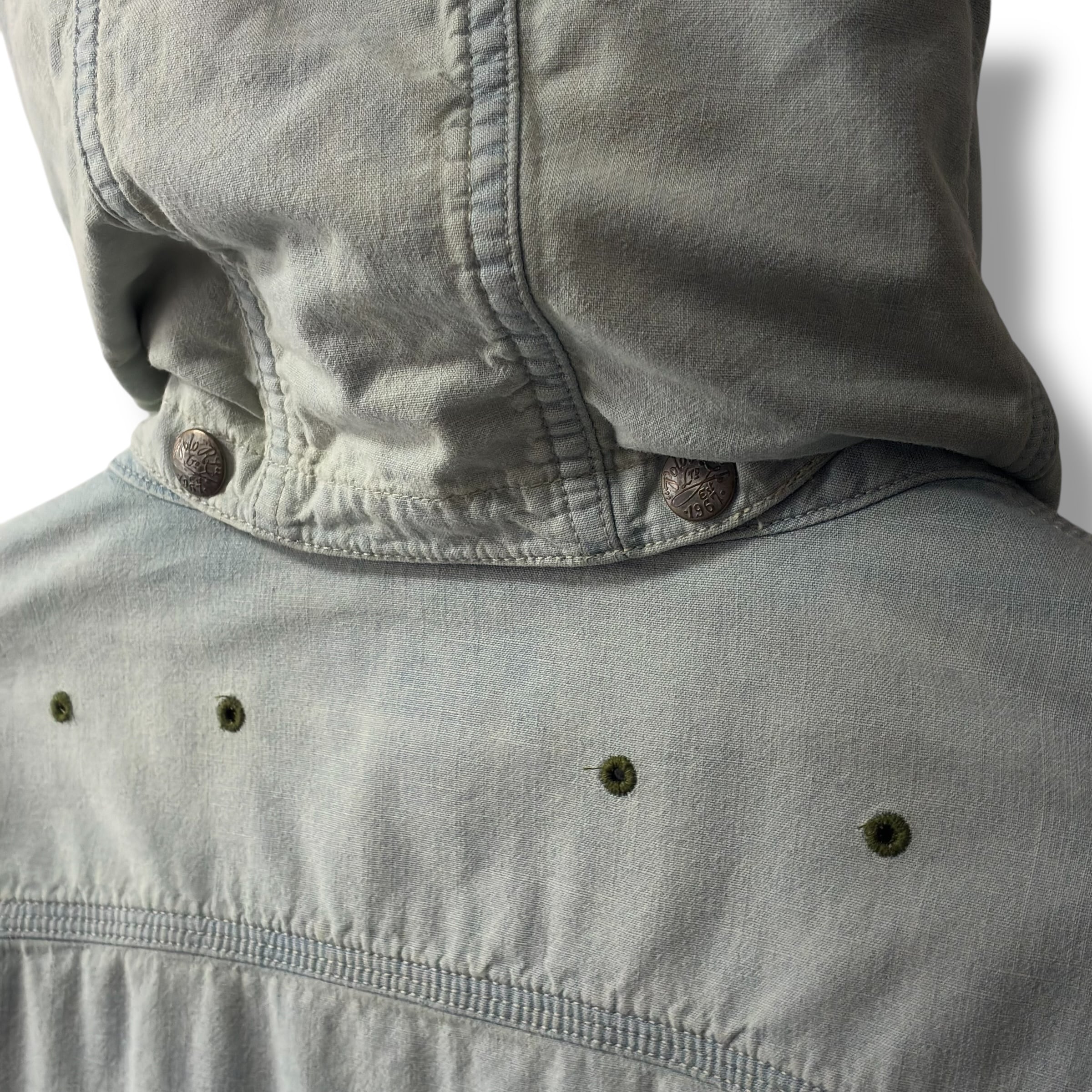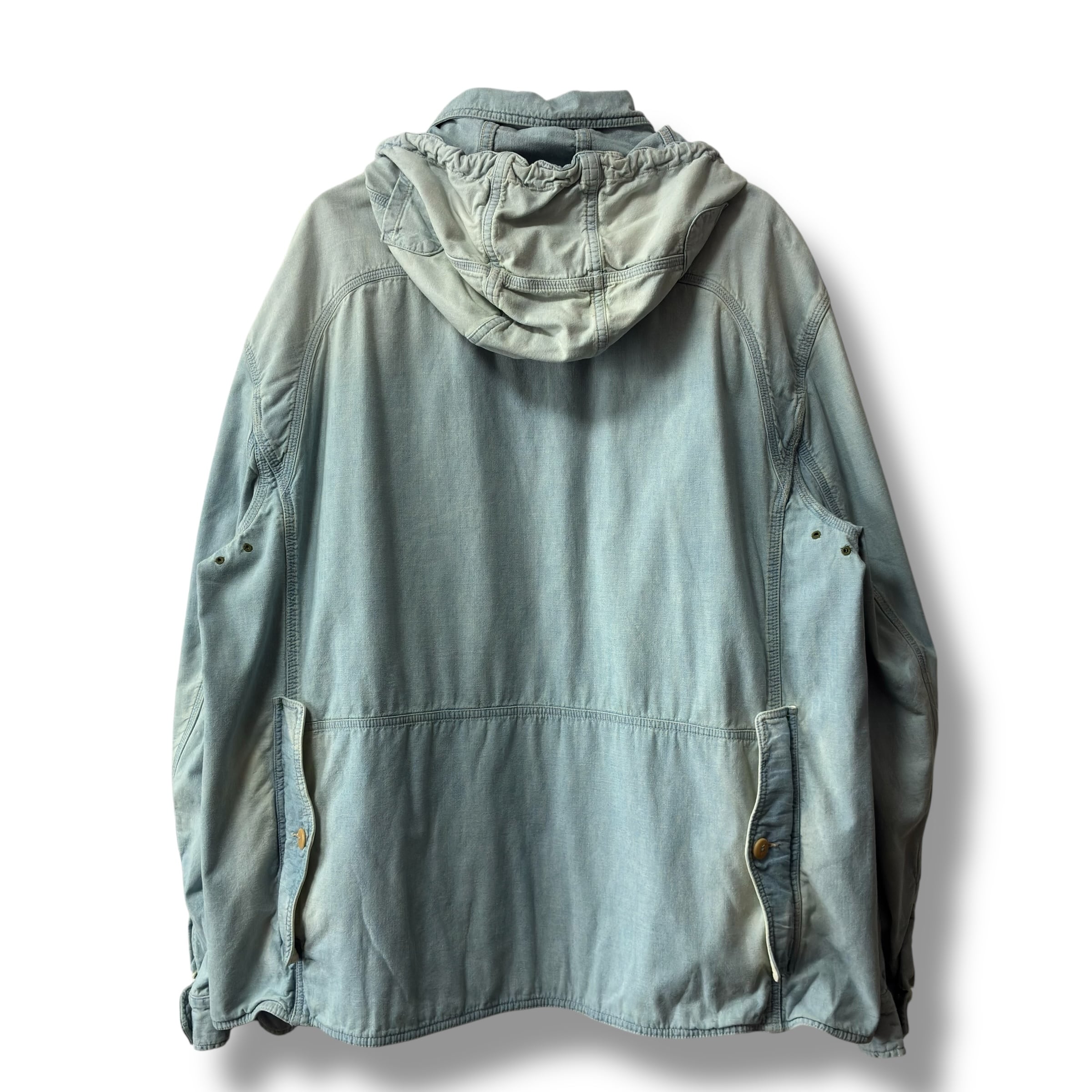 スナップボタンで着脱可能なフード、シェルのウォッシュ加工、複数のポケットや内側のセルビッチ等つくりは本格的。