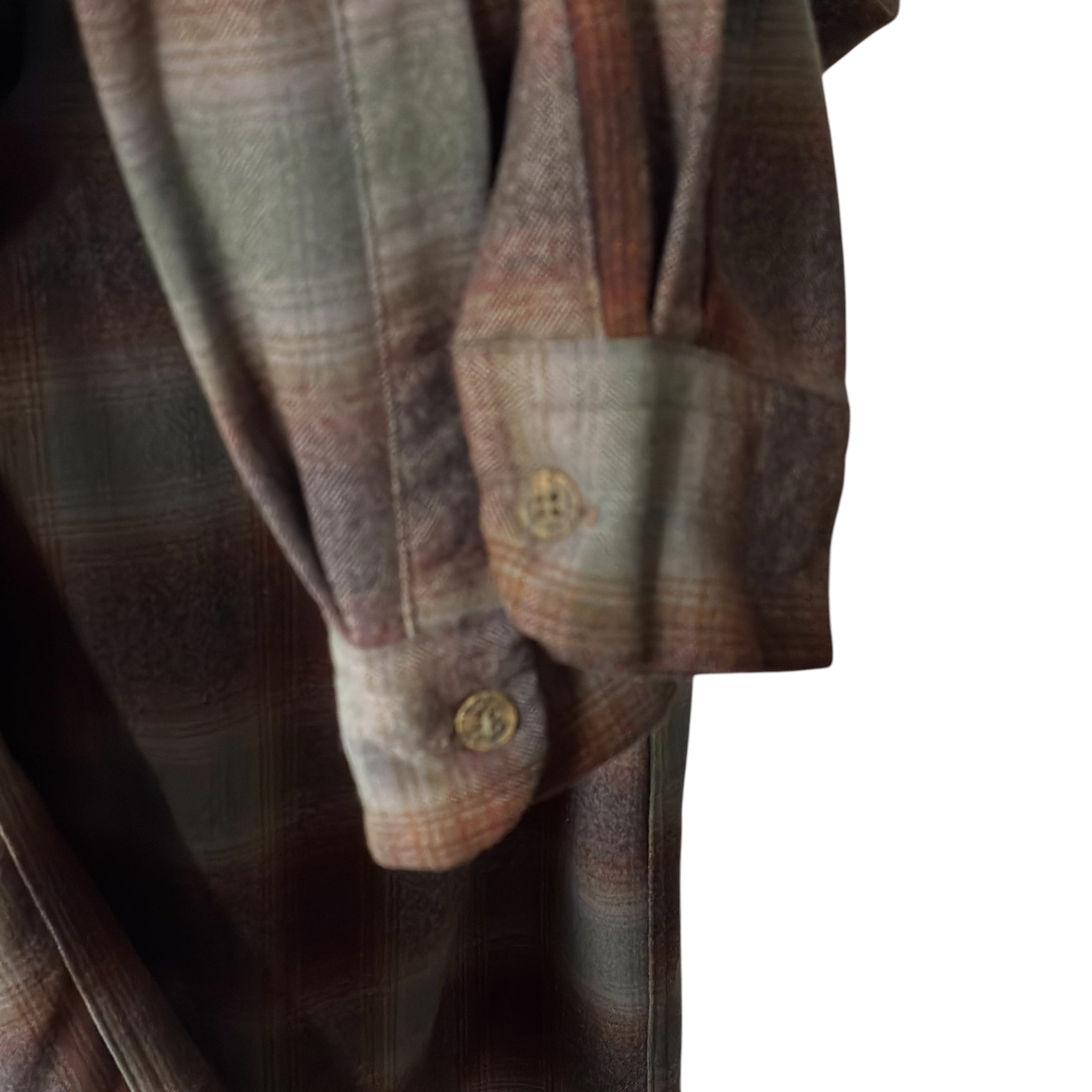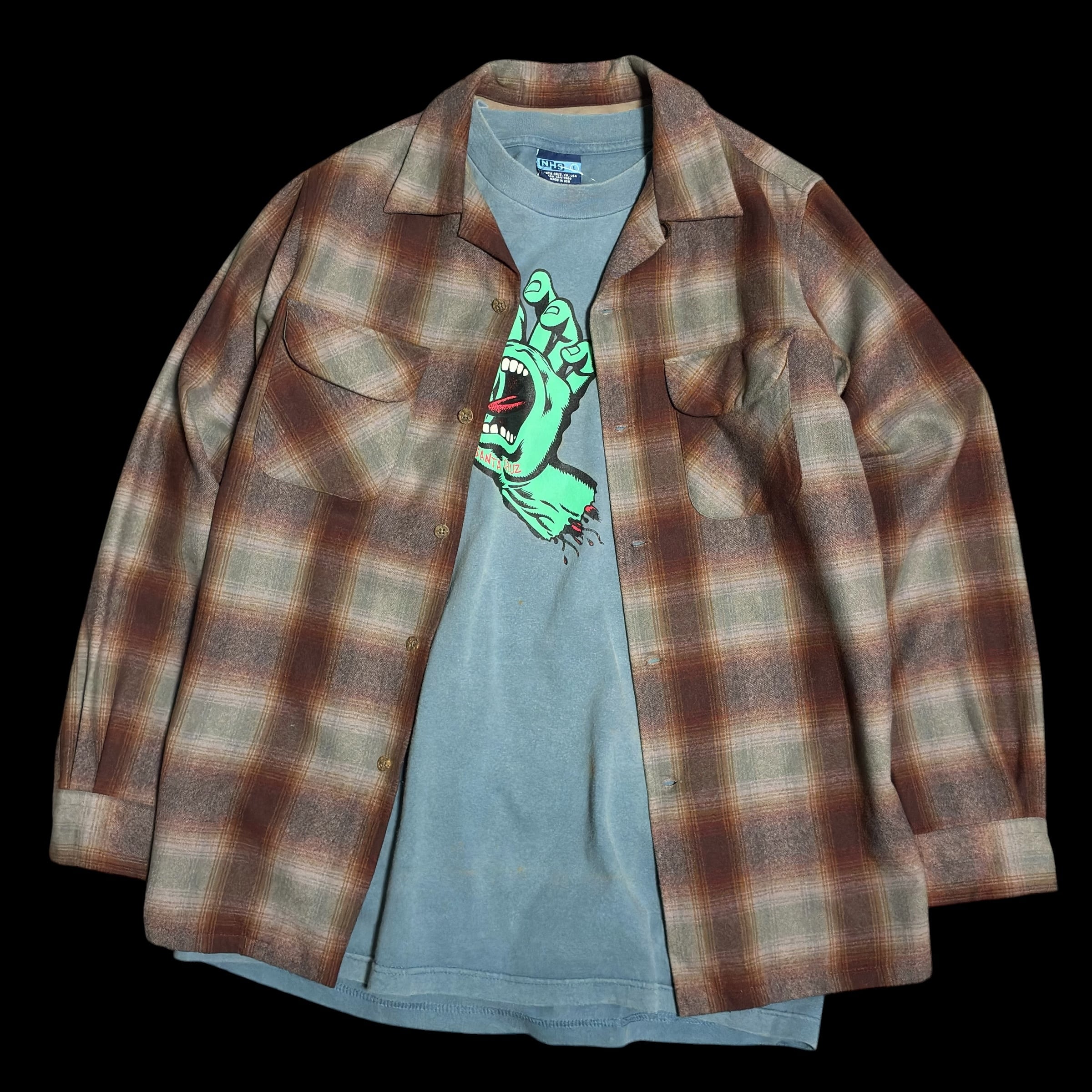 jay着用は背景として勿論素晴らしいですが、とにかくこのシャツの配色、ブラウンにウグイス色の様な色を入れたオンブレ、これがまた良い。